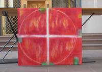 Hier ist das schmale Kreuz aus der Mitte gerückt. Es gibt Spannung. Vom unteren Rand auf steigen züngelnde Flammen auf. Der Dornbusch brennt.