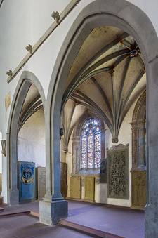 Die historischen Grabplatten werden beleuchtet durch zwei Fenster, die seit 1936/37 Glasgemälde des Kunstmalers Albert Fink beherbergen. Ein Fenster zeigt den erhöhten Jesus Christus, das andere den auferstandenen Herrn.