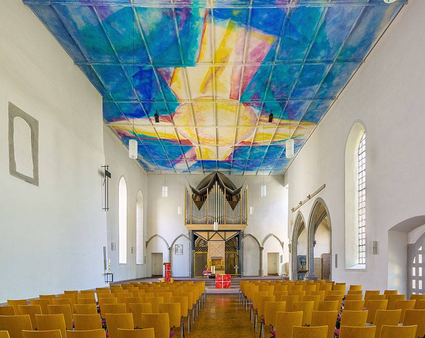 Hell und lichtdurchflutet leuchtet der Kirchenraum in einem ausgewogenen Zusammenspiel alter und neuer Elemente. Die für protestantische Kirchen typischen schlichten weißen Wände bilden einen Rahmen, an denen der Blick nach oben auf die eindrucksvolle Deckenbemalung gezogen wird. Die Augen nach oben zu erheben öffnet den Raum für den Himmel über unserem Leben. Der Blick nach oben durchbricht den Alltag und eröffnet den Blick für das Göttliche, das Wesentliche in unserem Leben.